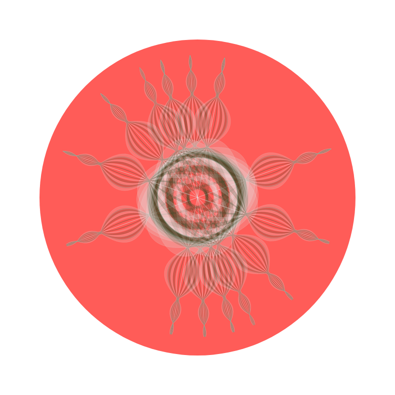 Reminiscent of festive Christmas tree baubles while tripping on acid at the family get together, this generative and animated piece creates shapes based on the standard Penner easing equations. Usually these equations are used to add a real-world feel to objects in motion. Here are they used to create symmetrical patterns, overlayed with each other in a circular world.