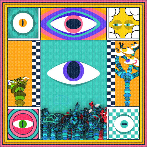 A collection of pokable eyes in different states of mind, surrounded by lush fractal trees with eyes, passionately coded and composed with p5.js to elicit a variety of flow states I experience while doing creative coding