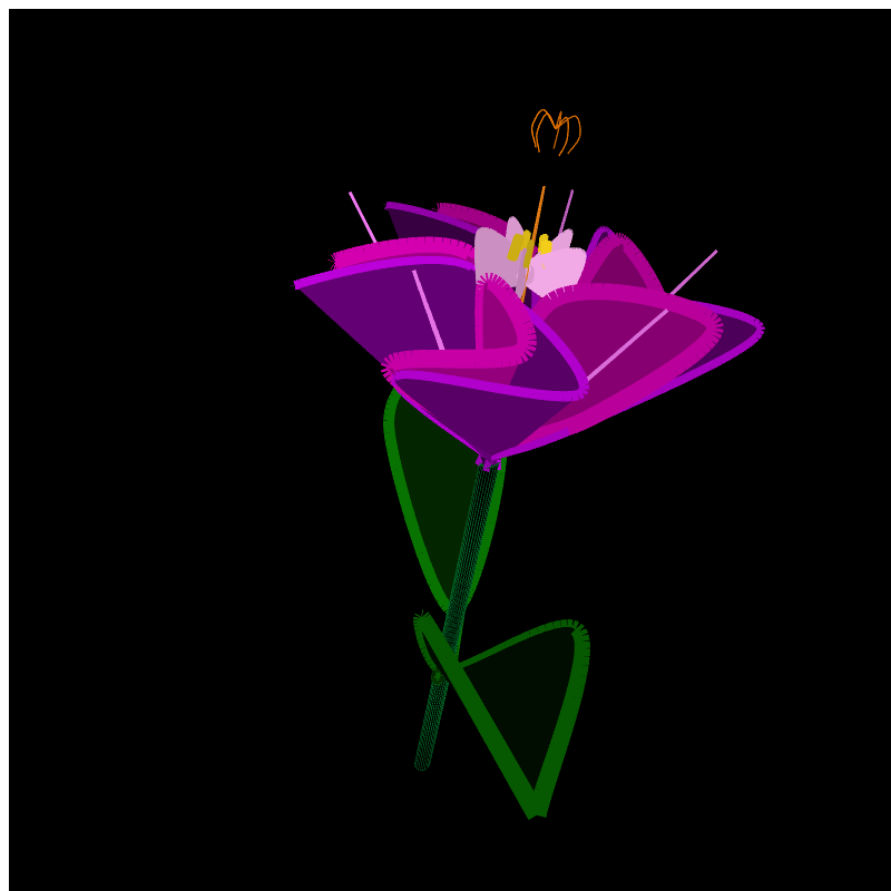 This piece is a 3D rotating flower with a spider on top, which you can even rotate it with mouse. this piece is generated by using p5js library. This flower is from my garden collection.