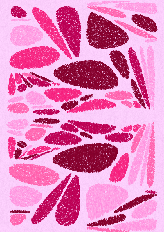 The series is controlled by a large number of random processes, from recursive subdivision with tweaks through Chaikin smoothing of the resulting polygons to mild domain warping of the entire canvas. Finally each shape is filled using small shapes, creating a warm and soft feel.