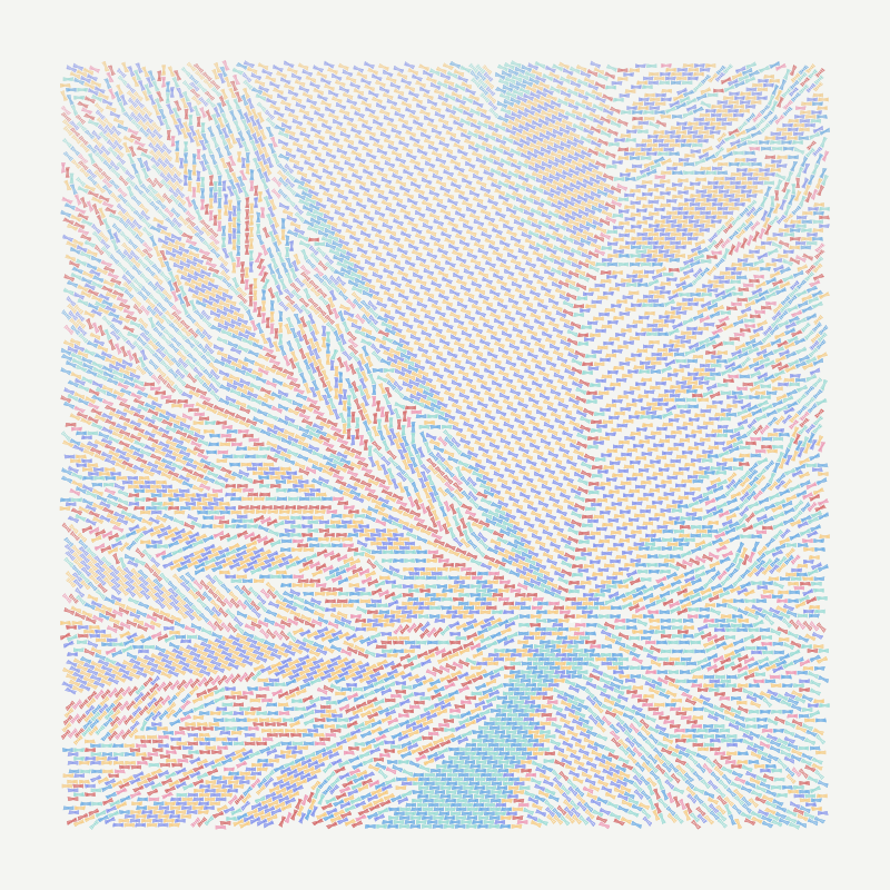 New shapes are placed closest to a moving target. In some mints, this target is slow moving, causing new shapes to expand radially from the seed. In other mints, this target races around, causing new shapes to chase it.