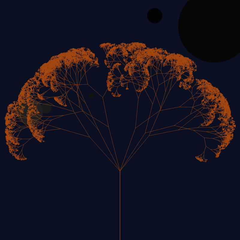 random fractal generating a tree with different shapes and colors, created using p5js