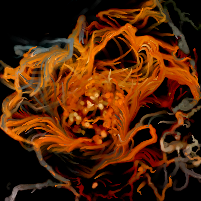An endless flow of particles draws a flower. Their paths are guided by the color values of an input image. One of the parameters in the system varies slowly over time, so the behavior of the particles changes. The digital painting on the screen, like a visualization of the swarm's behavior, shifts as well. Old strokes fade into black, constantly replaced by new ones.