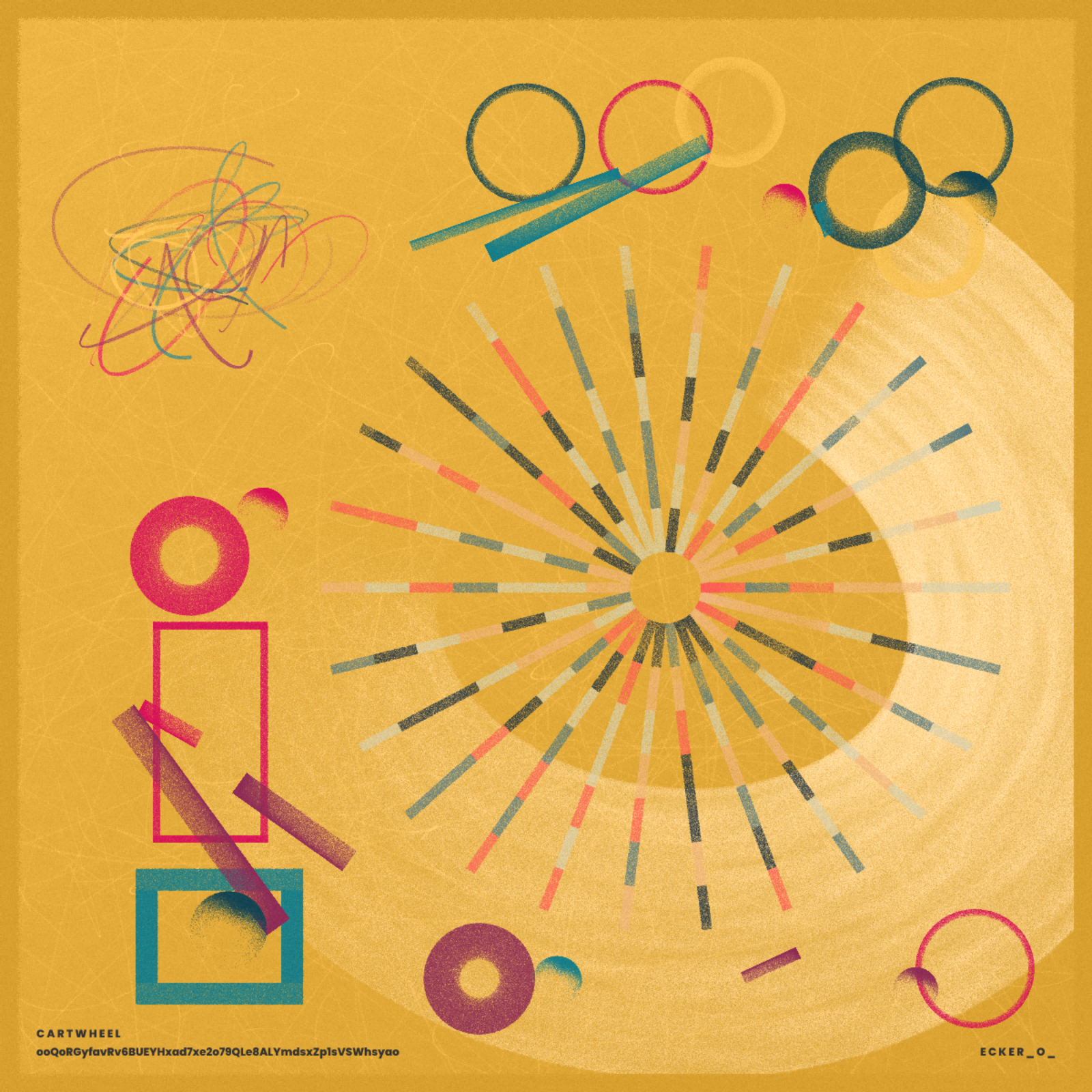 A generative piece painting a playful composition with a huge cartwheel on the center and partially overlapping shapes around it.