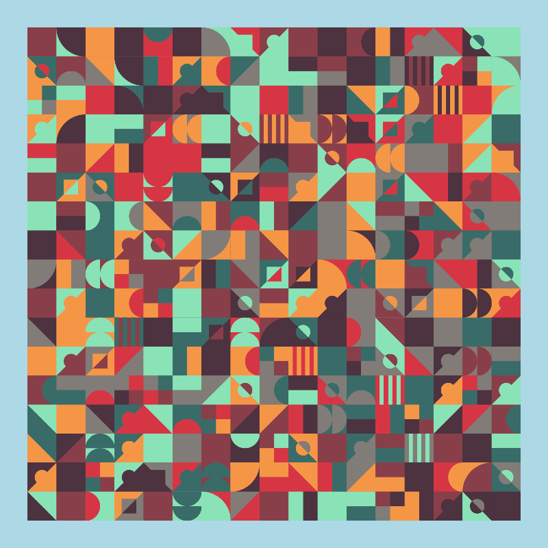 Each G-grid consists of 60 uniquely generated probabilistic geometrical shapes with 100 different color palettes, with each palette using colors range from 7 down to just 2 colors.