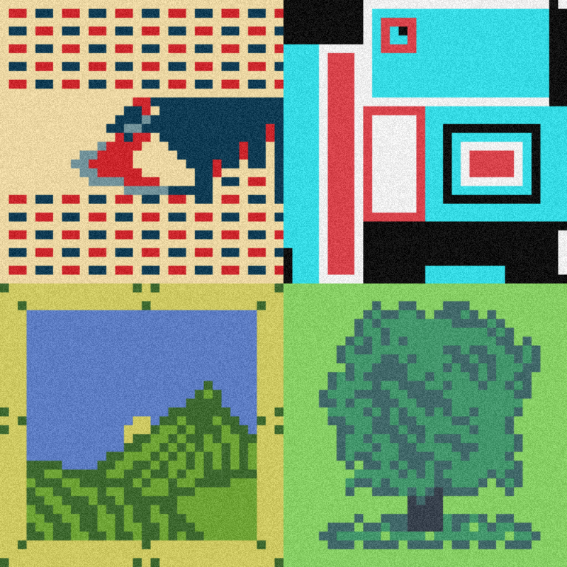 Artwork (PNG layers) is courtesy of the Blitmap team (via CC0 / public domain), randomization is powered by p5js and the fx(hash) platform.
