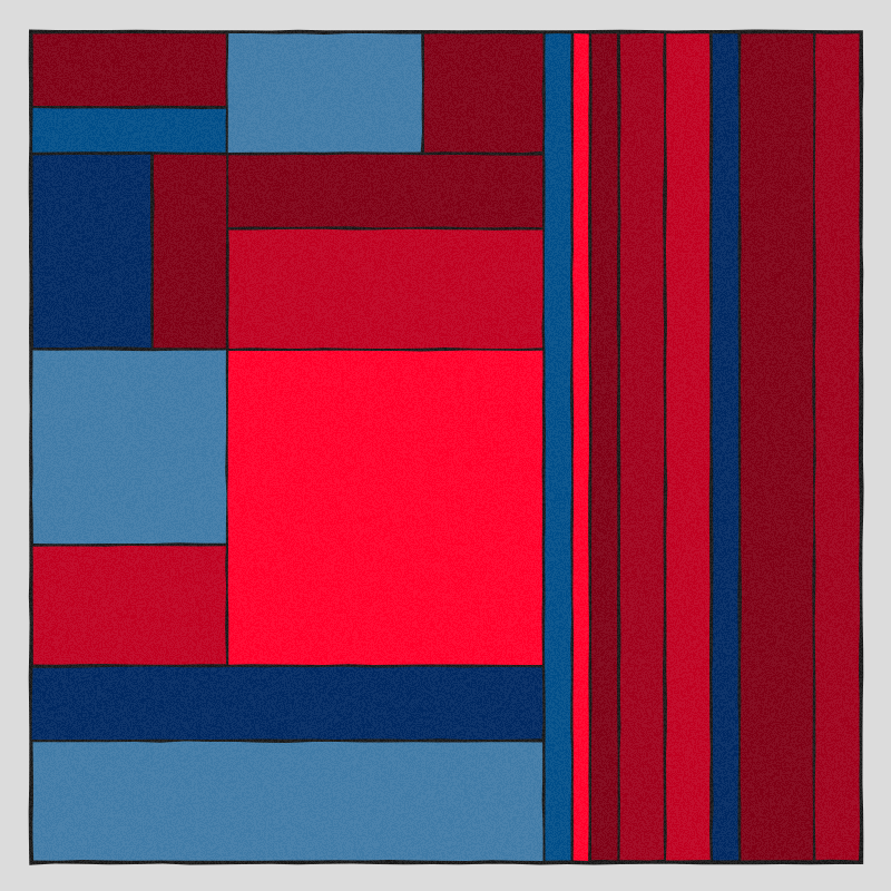 The beginning forms a square, which is divided with the rules of the golden ratio. The partition is done on the left, right, top or bottom side. Where to divide, is decided by chance.Two rectangles are created. The process repeats. The rectangles are partitioned again according to the described rules.
