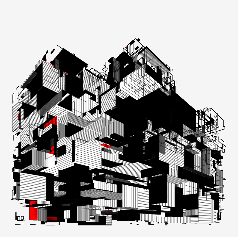 Rebuilding linear perspective from the ground up to generate improbable structures. Variations use one-point, two-point or three-point perspective, structures are rendered as lines, planes and volumes, colors are limited to ⬛🟥⬜!