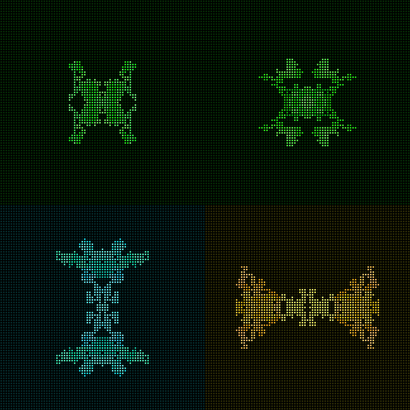 Each creature is randomly generated using using p5js. There are 6 base colors. Rarity is determined based on the number of colors used. The most rare combination is when all 4 creatures share the same color. Roughly 1 in 216 mints should have Colors=1.