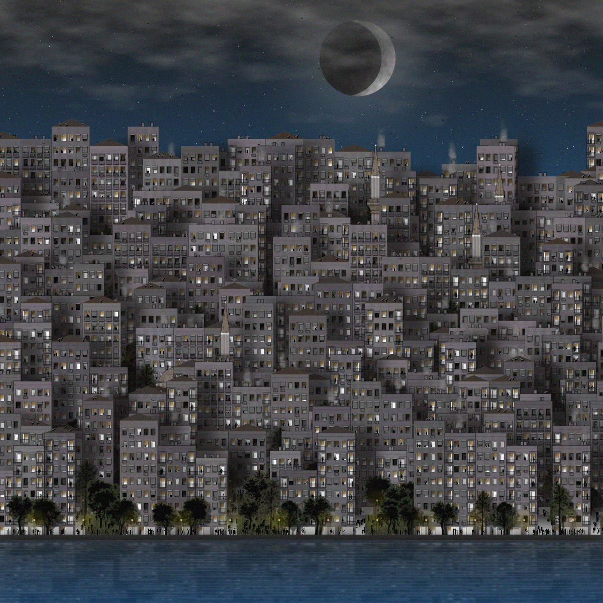 In this project, I tried to capture and interpret the daily life routine of the people who live in these hills with the viewing point from Bosphorus. There are three camera angle possibilities to examine the details in different layers. Also, building types, the slope of the hill, and green area density vary in between those scenarios. There are two time zones: day and night. In the night scene, there is a possibility to obtain the crescent moon which is the symbol of the culture inhabits in these lands.