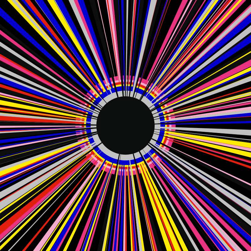 The piece takes takes up to 7 colors out of 16 to draw the star. The number of rays are a power of 2 and their angles add up to 360 degrees giving a sensation of balance and harmony to the viewer during the animation.
