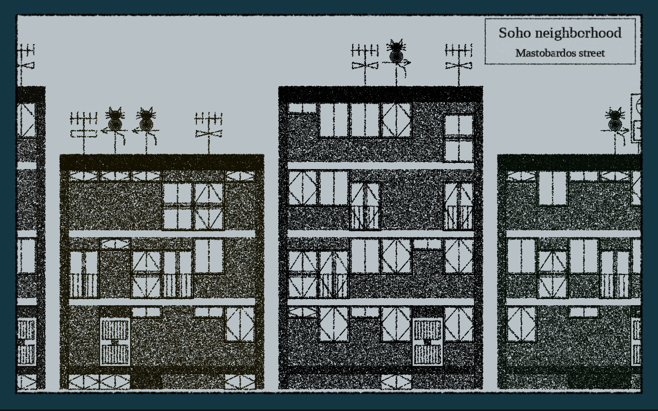 -Position of windows, door, and antennas, advertising banners, and rooftop cats
