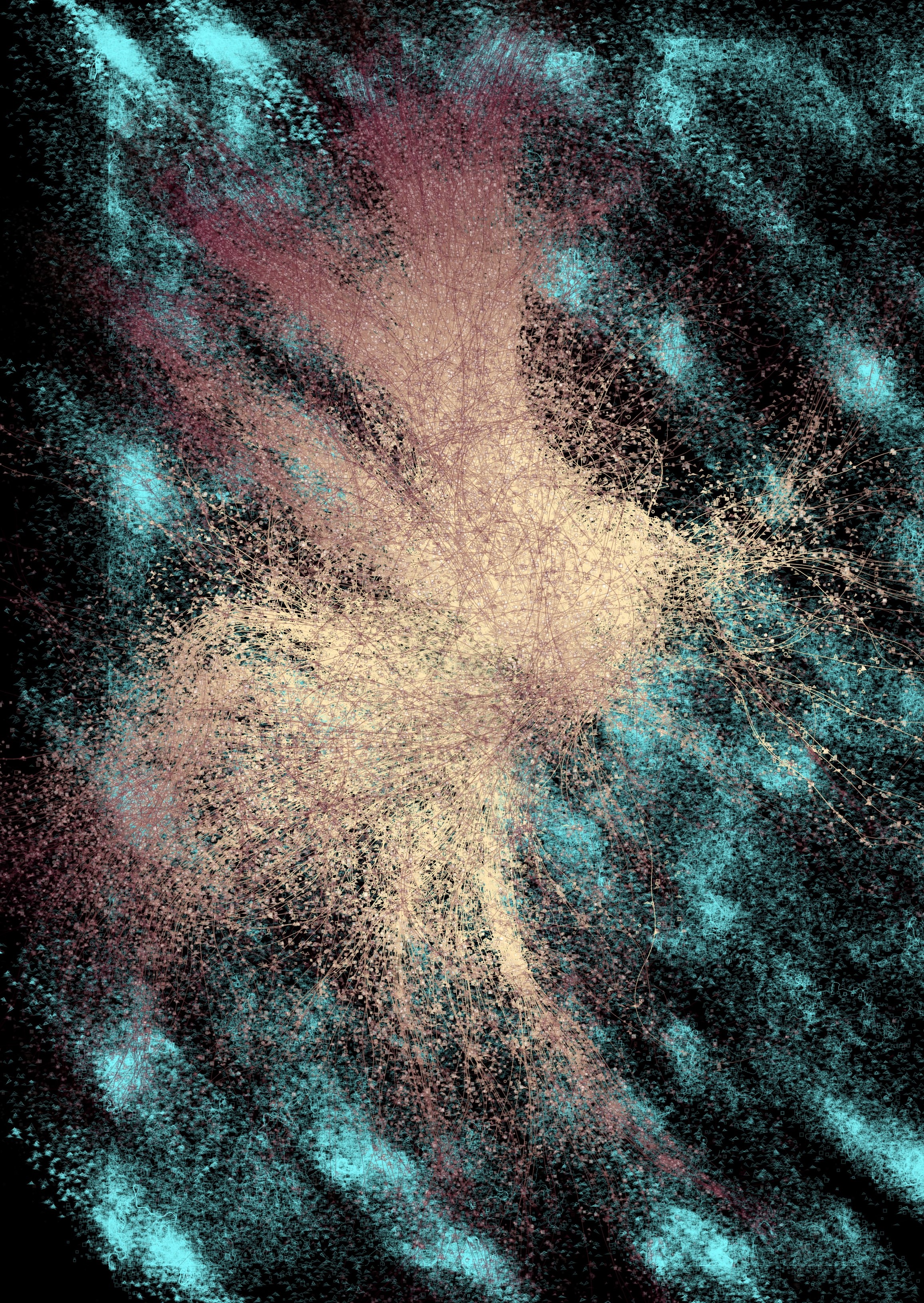 Inspired by the Phoenix Nebula. Entanglement is an exploration of what "spooky action at a distance" might look like if particles are actually paired across the aether. The cosmic microwave background influencing the formation of nebulae throughout space. Each new piece a new beginning.