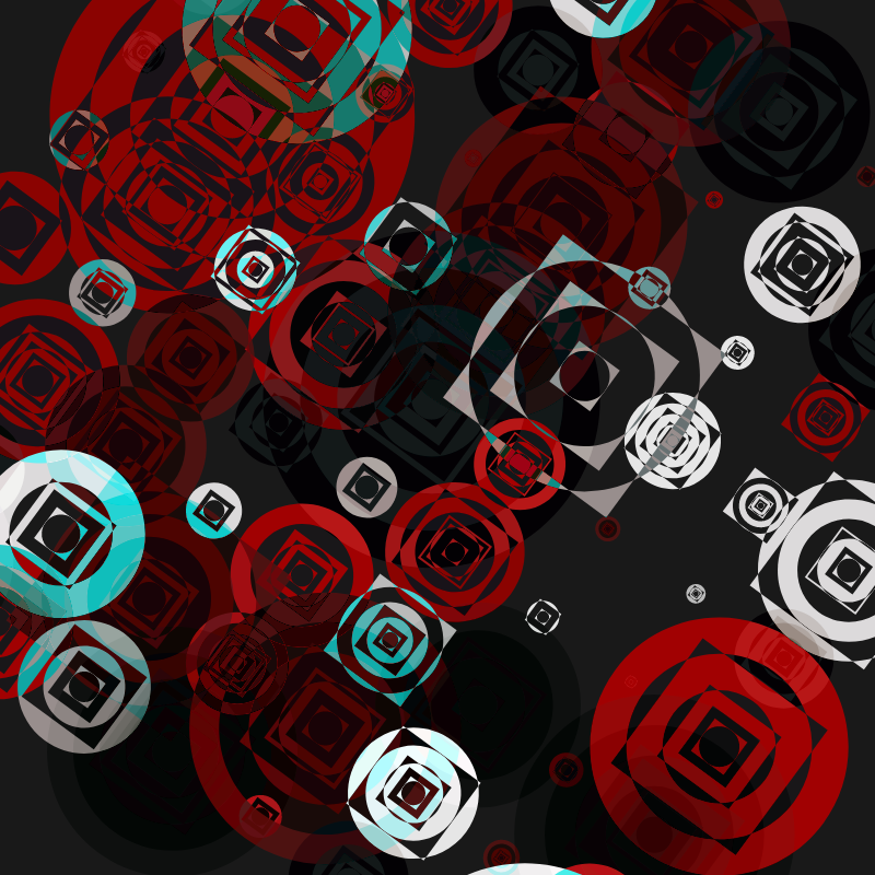 Generative algorithm creating a beautiful chaos of random size and color squares and circles inside a rotated matrix.