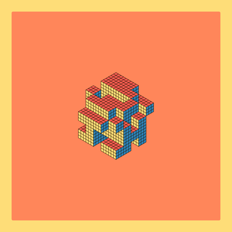 Isometric projection is a method for visually representing three-dimensional objects in two dimensions. For this piece I took the color pallete from the famous puzzle Rubik's Cube in order to create random structures that vaguely resemble a fortress.
