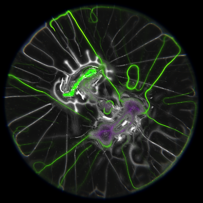 This work is based on the paper "Characteristics of pattern formation and evolution in approximations of physarum transport networks", written by Jeff Jones and popularized in the artistic field by Sage Jenson. Some features were added to increase the visual and behavioral complexity of the system. Agents are divided into different species, with their own set of rules and interacting with their own substrate. Substrates also interact with each other and agents will mutate in contact of some of them.