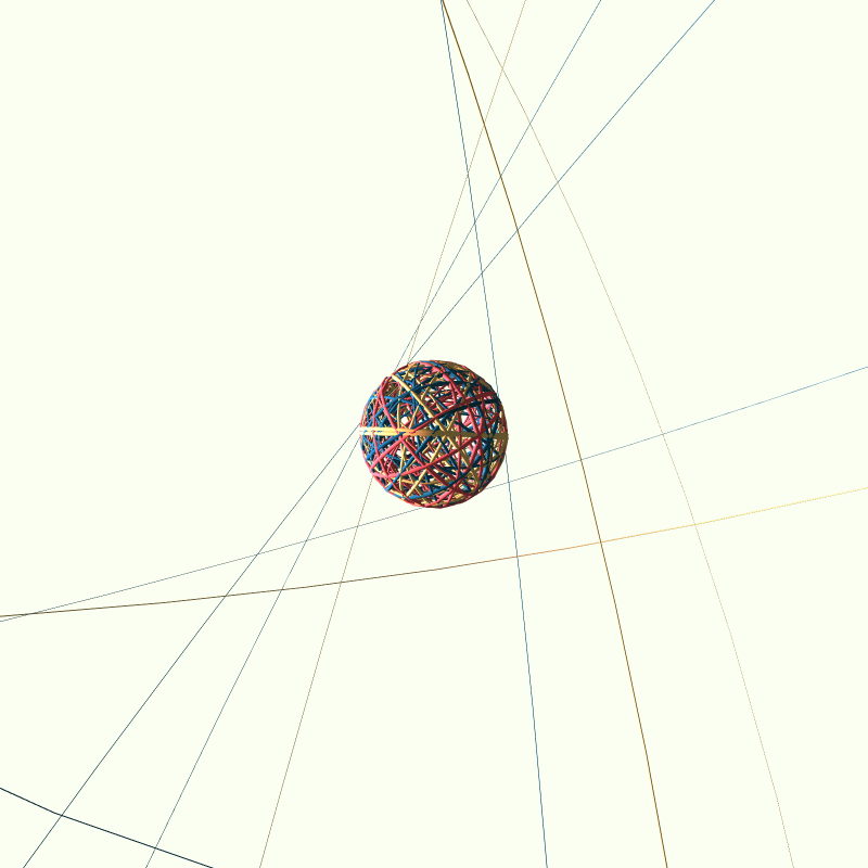 Using WEBGL for the first time, and more precisely the torus function in a rotating loop, giving as a result this rare figure that vaguely resembles a rubber band ball.