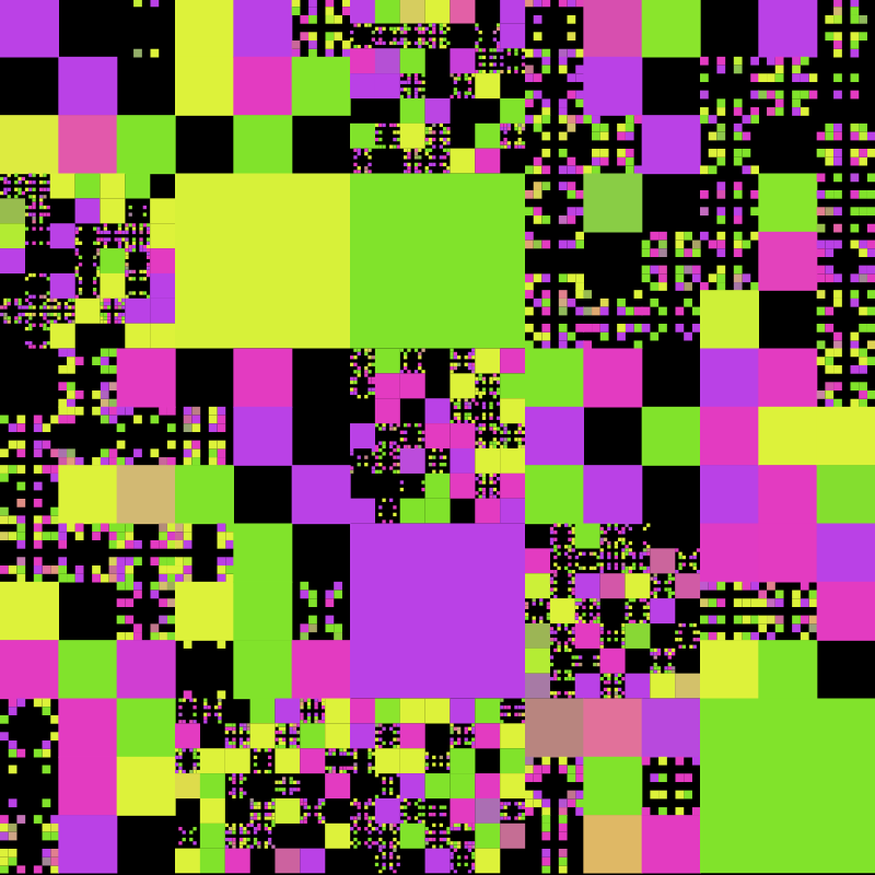 Pixel Chips is a series of animated pieces that are made up of squares which are then rearranged and reproportioned according to a set of rules, resulting in a unique, abstract pattern resembling a computer chip. The squares are constantly changing their color values, transferring from one to another, creating the effect of computation.