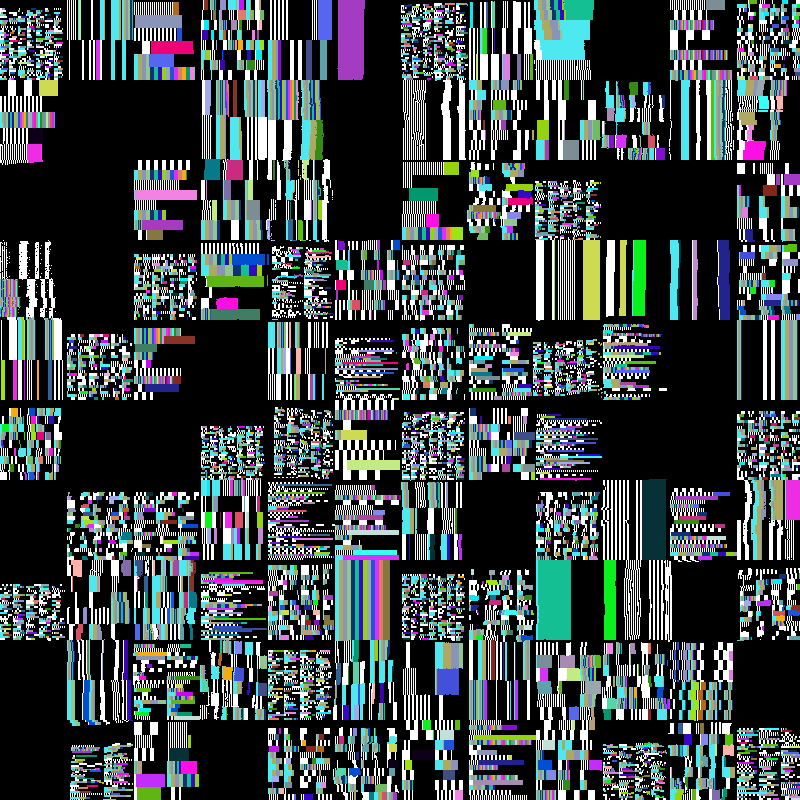 The WebGL real-time animation sets up an initial grid based on the fxhash. The grid cells get subdivided into another grid and the resulting cells become filled with pixels in color (~33%) or black and white (~66%).