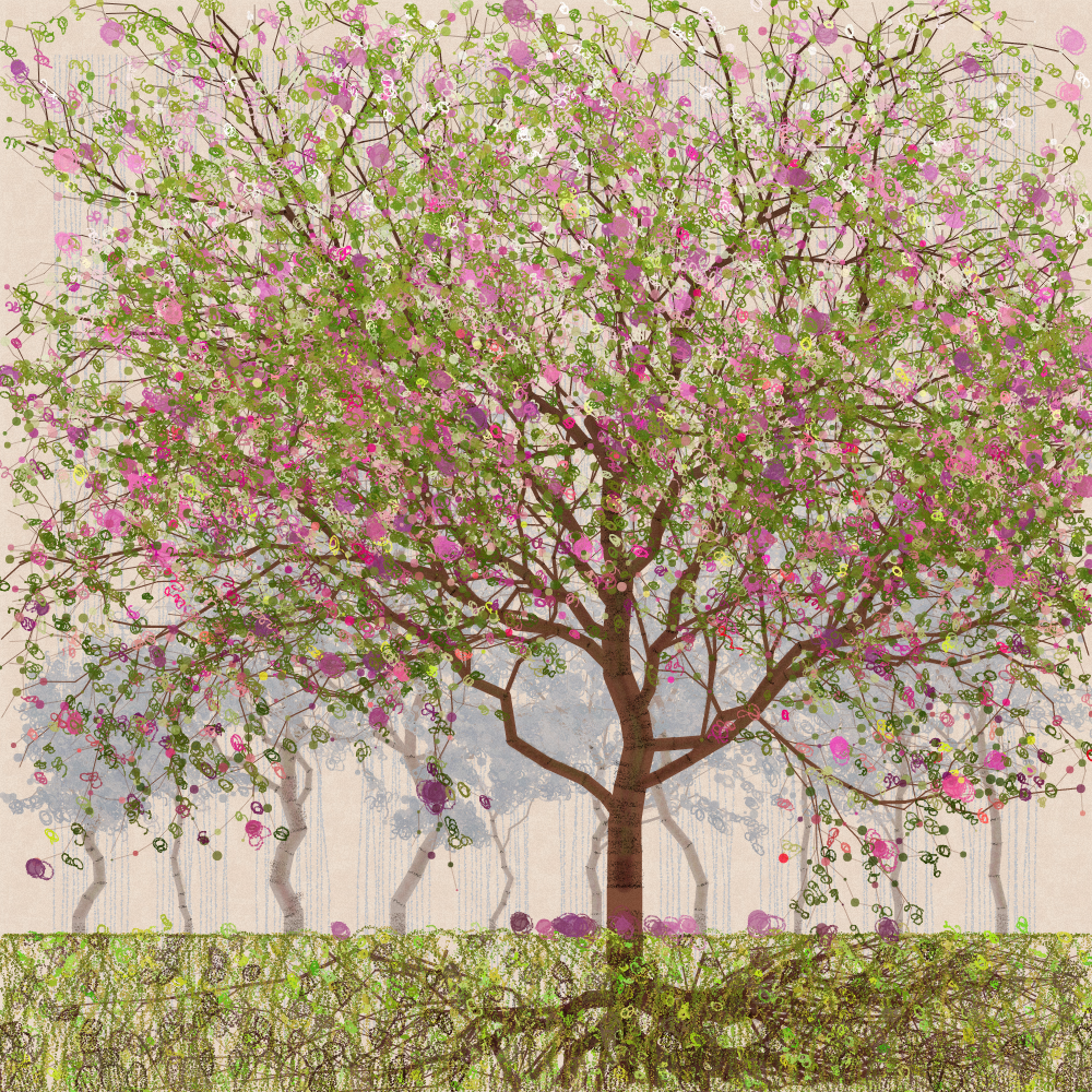 A natural media rendering of a fruit tree during one of the four seasons. Sometimes, you'll catch it at night - with lights strung on the tree!