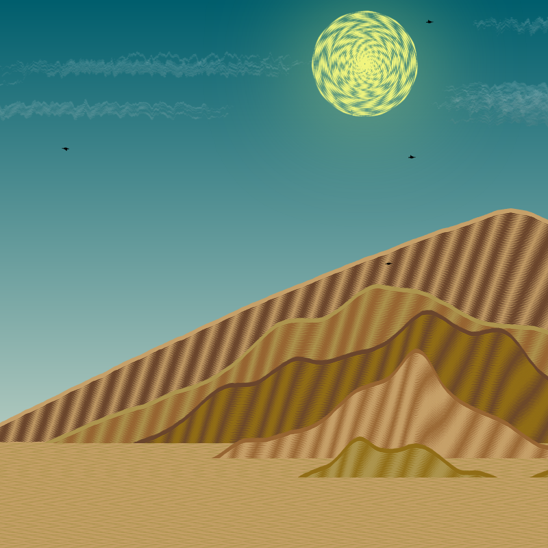 Layers are used throughout and illustrated by birds moving between mountains. The sun sets, the moon comes out, the sun rises. In perpetuity. No specific exactitude. Just a nice scene. A fun project with a crafted look. It was actually quite difficult to figure out when I was done with this project without being self indulgent. Hopefully I didn't go too far... There are many variations and constant randomness involved throughout. Shooting stars. A UFO maybe.