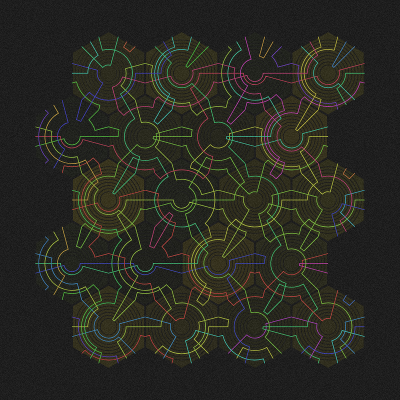Another adaptation of 10Print algorithm. Inspired by hexagon fields and cables management.
