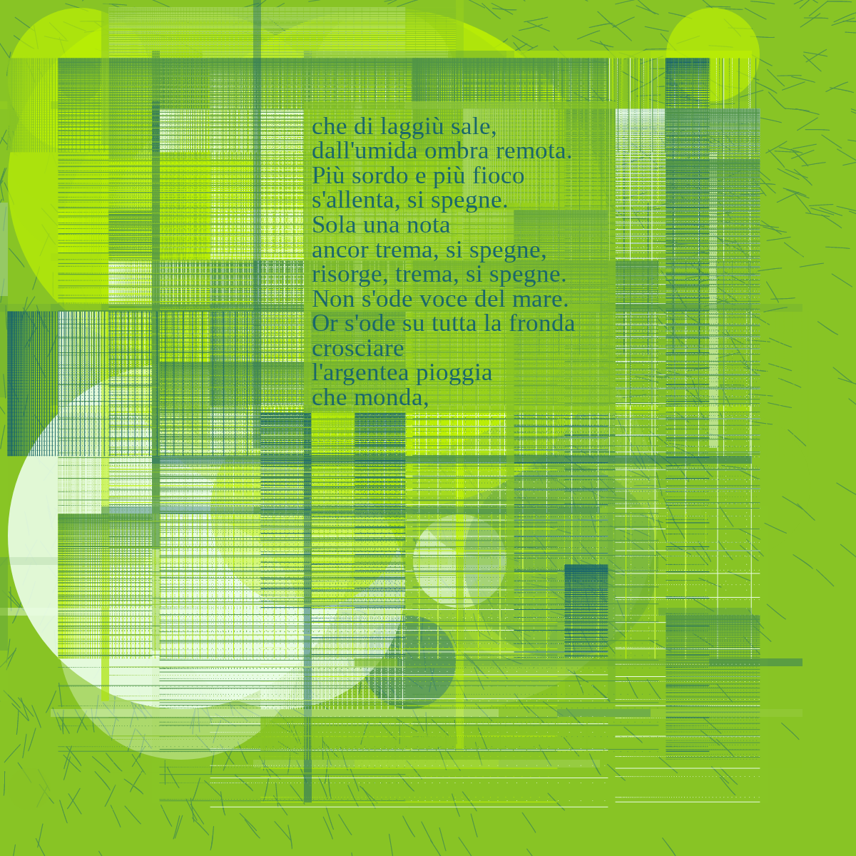 The heartbeat, the beat of a song, the lines of a poem, the spaces of a typographic grid: the rhythm marks our life and our emotions. But entropy bursts into our lives like a summer storm; it takes us by surprise as we stand at the window to admire the natural life cycle. Piove 💧 tells these feelings with purely generative compositions on a dynamic grid and casually re-proposes lines from the immortal poem "La Pioggia nel Pineto" by Gabriele D'Annunzio.