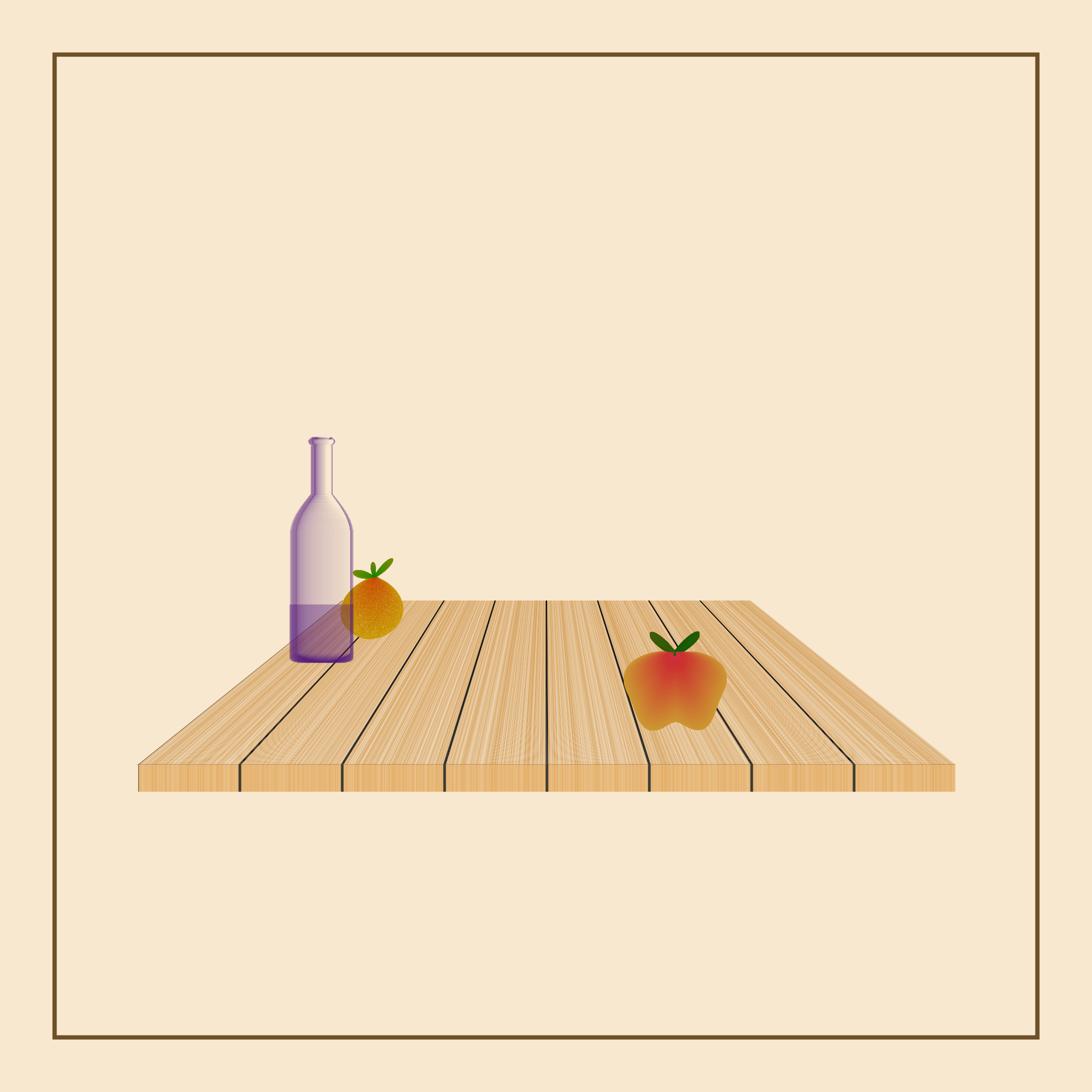 The four kinds of fruits, the bottle, the wood texture are all generated purely from minimal algorithmic code - totalling less than 200 lines for the core drawing code.
