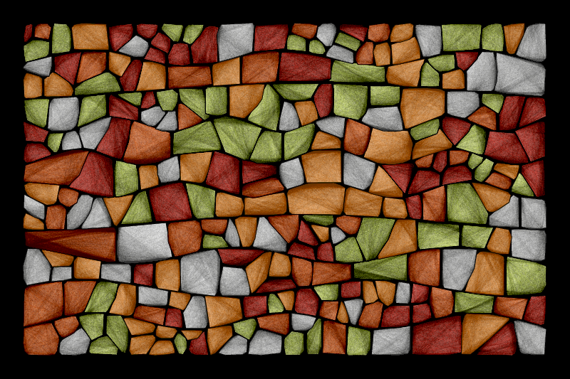 This work represents abstract drawings of tightly packed stones. Each stone is unique with its own shape and texture made by drawing thousands of lines between its edges. All drawing is made in 2D without using effects, filters, or external textures. There are several types of stone arrangements and over 70 carefully selected color palettes. The process of generation is animated. As a bonus option, you can draw variants with green or sunburnt grass in the space between stones, or with moss over the stones. Best viewed in live mode.