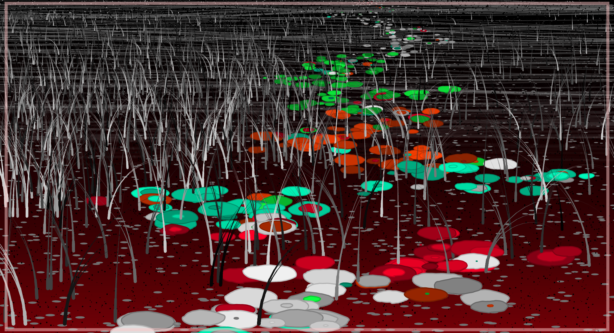 I started with an ink sketch, first, to get some idea how to turn my hand movements and pen strokes into procedures. Using simplex noise, recursions and stochastic constraints to the scale, color, distribution and density, I created a system that returns a simple landscape with rich texture in a compelling palette.