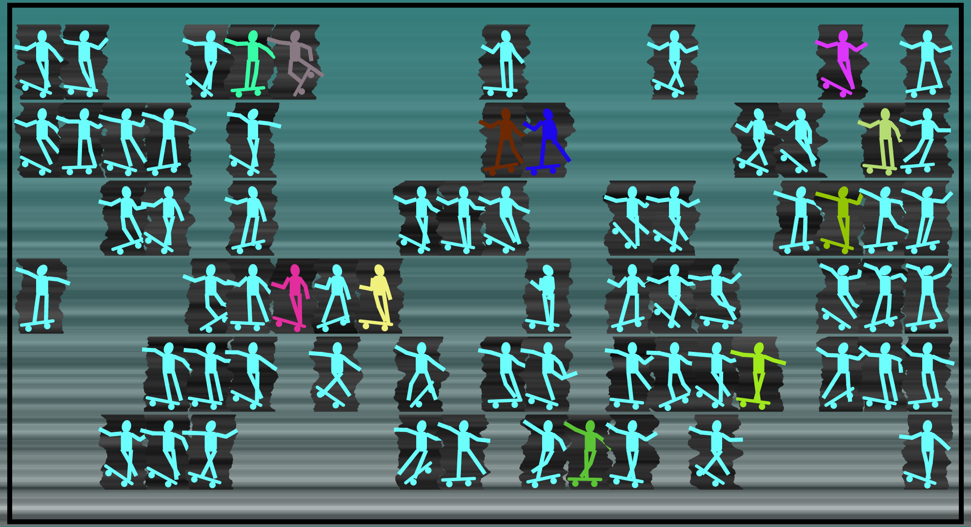 "Shred" is an adaptation of a previous work, called "Cliques." Expanding on the figure's articulation, "Shred" poses the form in an action scene with a skateboard. Each figured is backed by a "shredded" rectangle that represents a departure from the mainstream environment. Ten percent of the figures (on average) have a diverse color palette, signifying the diversity and marginalization that can occur within cliques.