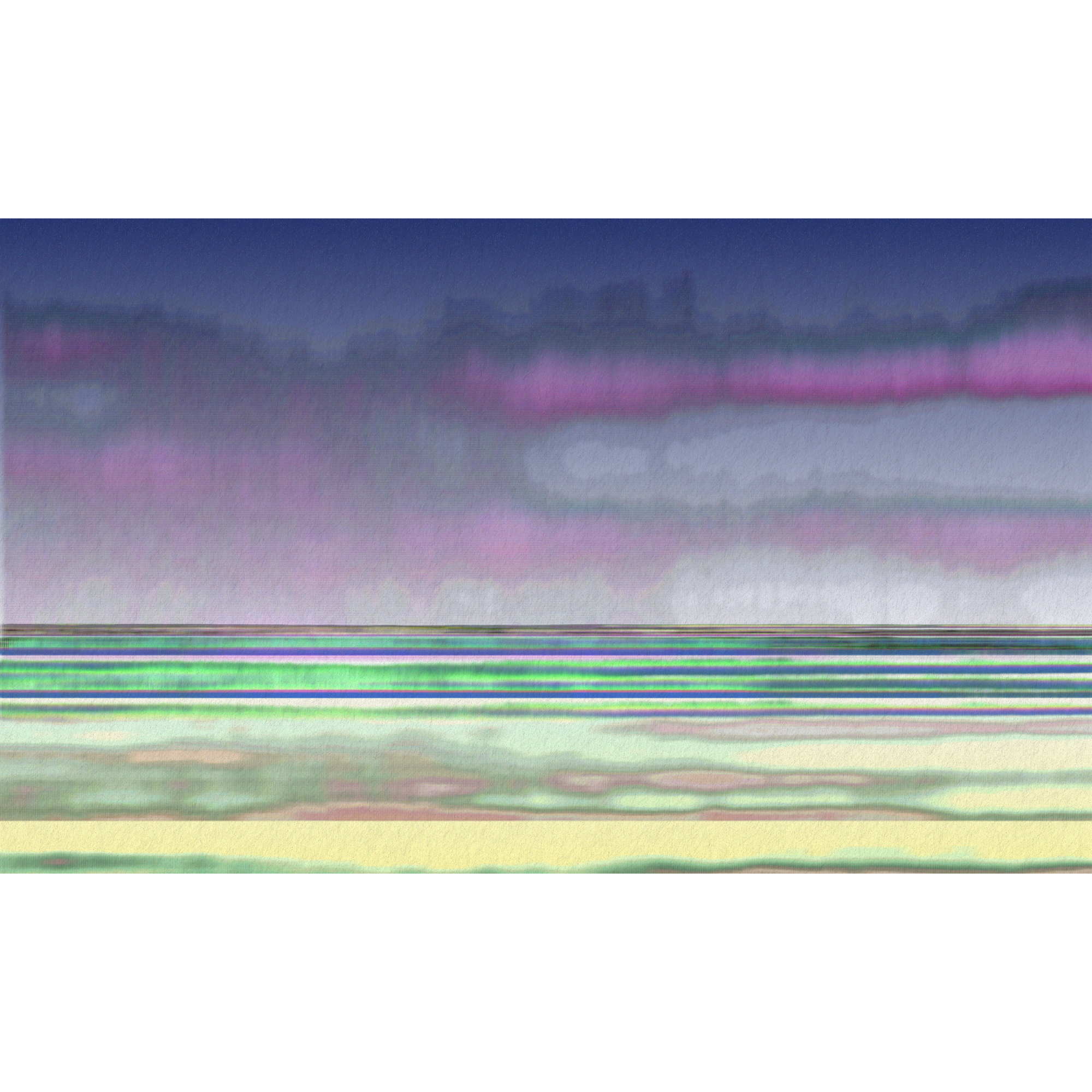 A depiction of the bleakness and beauty of a Quebec winter, showing a frozen lake stretching off into the cold distance. Hints of storm clouds and the Northern Lights are visible, along with the occasional lone ice-fishing shack. L'hiver est une camisole de force...
