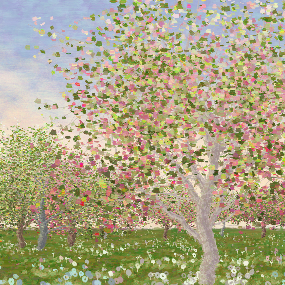 A generative, impressionist painting of a small grove of trees in one of the four seasons. In spring and summer, flowers bloom in the meadow. A rare variation will create a charcoal drawing on white or black paper. Super rare will create a lighted winter scene that may have a moon behind the tree.