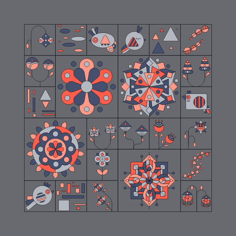 All flowers, nightingales and leaves are illustrated based on geometric shapes.