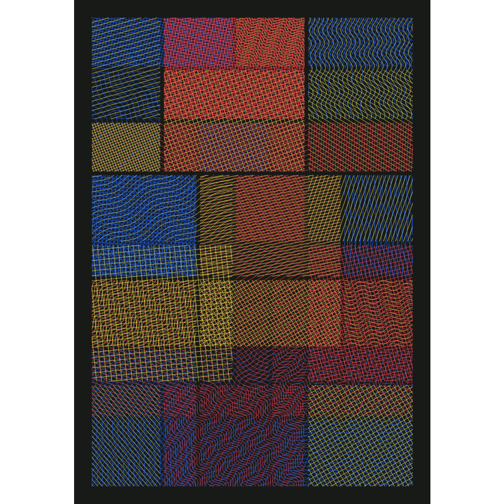 Pattern Grid Chaos is a generative art work where patterns of 3 colors (red, blue, and yellow) overlap each other, to reveal an abstract stained-glass visual. This process creates an illusion that tricks the eye into seeing the full color spectrum. On some occasions it's very bright like rainbows, and sometimes it takes beautiful pastel notes. The line patterns crossing each other will also reveal new textures and shapes. It can look like glitches (old TV noise is the first thing that comes to mind) or it can take a more organic form like complex waves.