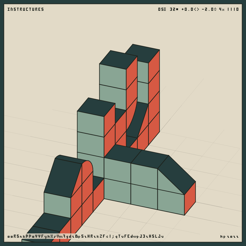 Instructures explores the endless and diverse outcomes when a minimal and straightforward set of instructions are followed to build structures out of cubes. Between 4 and 8 instructions are selected and used to generate a unique structure for each edition. The available instructions are “stack”, “pile”, “plane” and “sculpt”. As a last step, flat and/or rounded corner details are optionally added to each structure.
