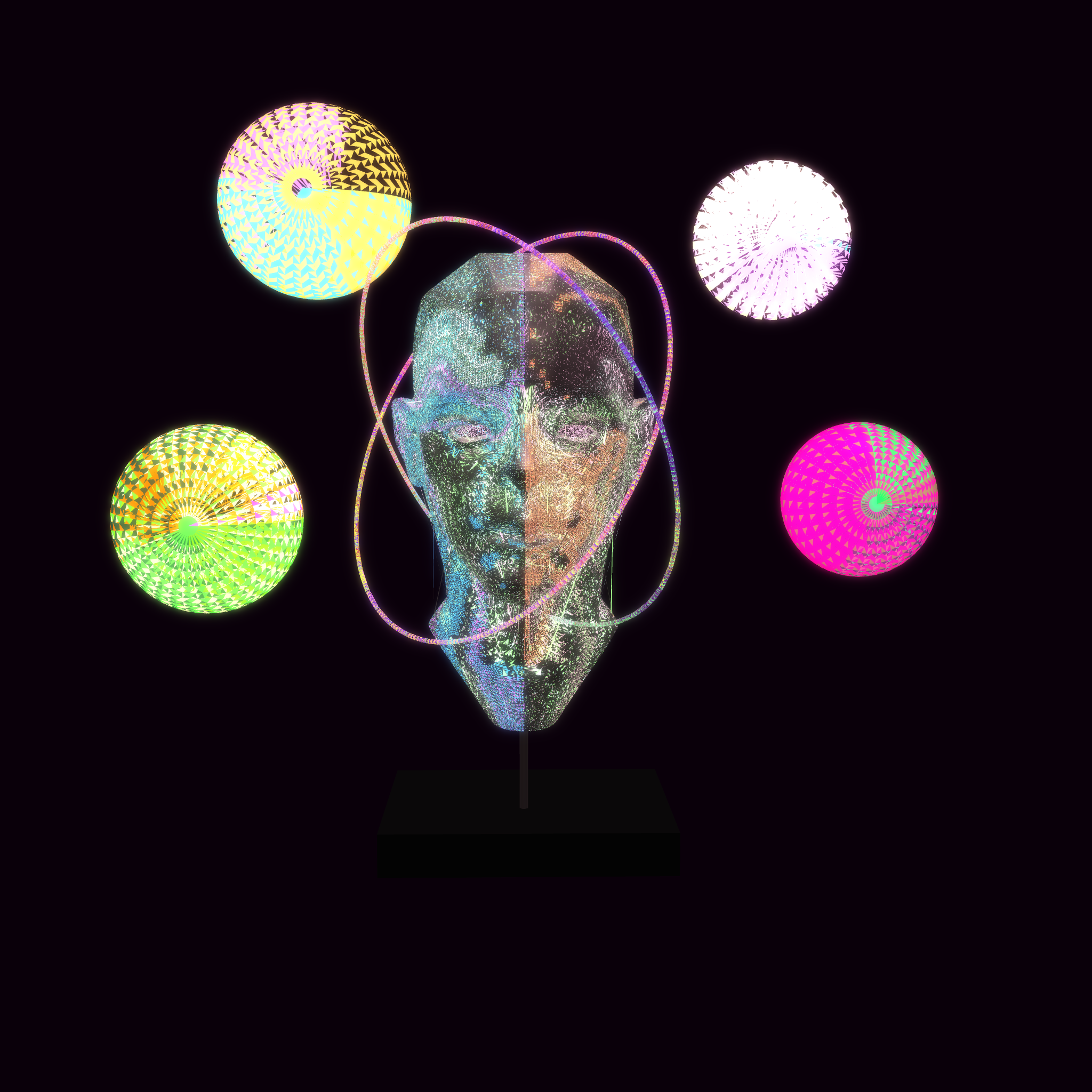 Seed that represent which color will be used and which material applied at a random number faces of each mesh in the scene. (Four Sphere and head)
