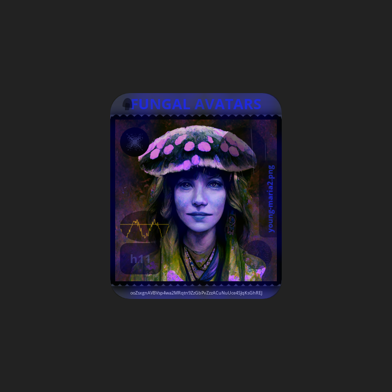 Here you find mycellium avatars imagined and generated through today interplanetary internet, each hash leading to a different hue variation and with one fungi verse inspired from Maria Sabina curandera poetry.